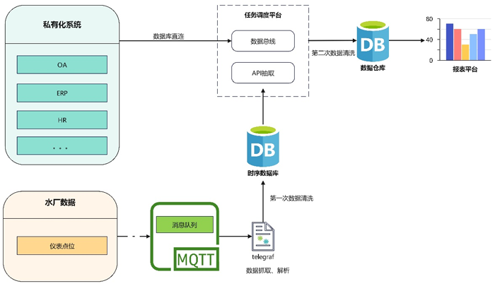 華騏環保以含山西區污水處理廠為試點,率先建成“全數字化運營水廠”,通過引入高性能時序數據庫實現對設備狀態、運行參數、水質監測、水量計算、能耗與藥耗等海量數據的高并發采集與傳輸,并通過分庫、分表架構并結合不同工藝結構完成多源異構數據的統一存儲與快速響應。整體技術架構不僅解決了傳統水廠數據孤島問題,更通過標準化數據接口為上層智能應用提供“原料”,達成智能化決策輸出。目前,數據平臺日均處理全自營廠數據量超百萬條,統一存儲運行數據達38億條,為后續的算法提優與模型泛化奠定了堅實的數字化基礎。