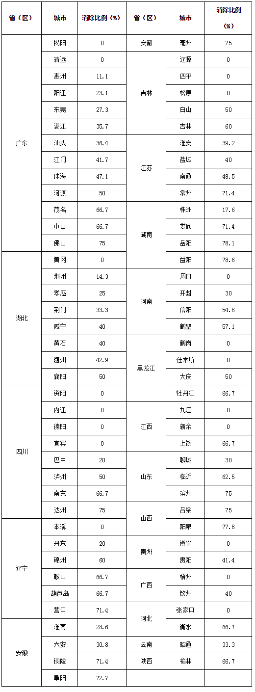 根據(jù)排查結(jié)果,全國共有77個城市黑臭水體消除比例低于80%,涉及廣東(13個城市,下同)、湖北(8個)、四川(8個)、遼寧(6個)、安徽(5個)、吉林(5個)、江蘇(4個)、湖南(4個)、河南(4個)、黑龍江(4個)、江西(3個)、山東(3個)、山西(2個)、貴州(2個)、廣西(2個)、河北(2個)、云南(1個)、陜西(1個)。其中,四川省內(nèi)江、德陽、資陽、宜賓,吉林省遼源、四平、松原,廣東省揭陽、清遠(yuǎn),江西省九江、新余,黑龍江省鶴崗、佳木斯,湖北省黃岡,貴州省遵義,遼寧省本溪,廣西壯族自治區(qū)梧州,河北省張家口,河南省周口等19個城市消除比例為0。具體城市名單及消除比例見附表。