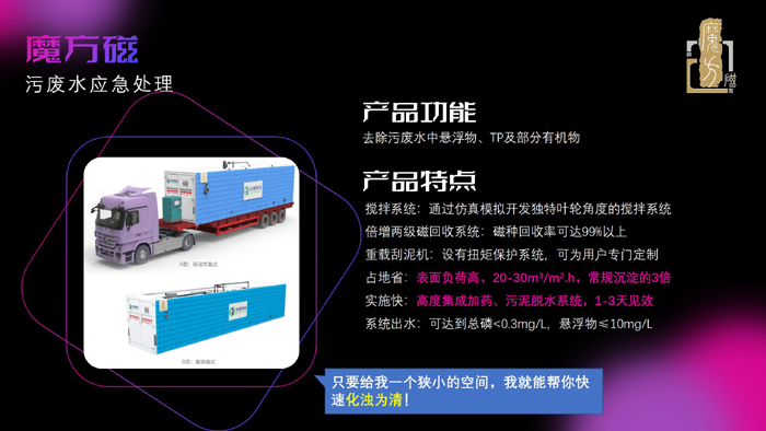 狹小空間亦可快速化濁為清——針對水體治理,以及污水處理廠、工業廢水廠應急處理場景,要求快速解決污水感官問題,以及去除TP的情況下,可以選用魔方智水的魔方磁,其功能是去除SS和TP,它有車載式和集裝箱式兩種形式,采用磁加載混凝澄清技術,表面面負荷 20 以上、停留時間是常規沉淀技術的 1/3-1/4,占地小,處理效率高。高度集成了加藥、污泥脫水以及控制系統,快速部署,快則1天,慢則3天就即可見效,處理效果立竿見影。